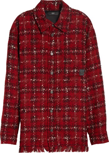 Americana-inspired style informs the crimson plaid patterning a longline overshirt woven from wool-warmed tweed.