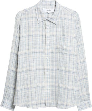 This fine-lined plaid shirt is made from a slightly puckered fabric woven from cotton and linen with a touch of stretch for a wrinkled texture and breathable comfort during the transition to warmer weather.