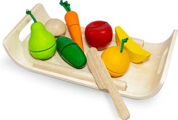 Little ones will love playing chef with this produce set that features pretend fruits and vegetables that split apart along with a wooden serving tray.
