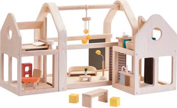 Spark creative play with a modular dollhouse that can be rearranged in a variety of configurations and that slides together for compact storage. For eco-conscious appeal, the house and accompanying furniture are crafted using sustainable rubberwood.