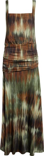 This smooth jersey dress is painted in a fluid, expressive print colored in pine green and chocolate tones. It's fashioned with a square neckline and a softly draped waist detail that wraps across the flowy skirt.