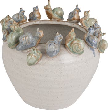 - A rounded stoneware planter with sculpted snails perched along the rim, finished in a speckled reactive glaze of blue, green, and cream