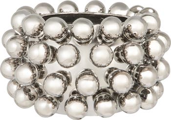 - A striking round stoneware planter featuring decorative sculpted ball accents and a sleek chrome finish for a bold, modern aesthetic