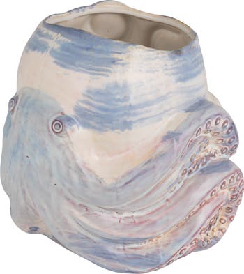- A whimsical white and blue stoneware planter featuring a sculpted octopus detail and ocean-inspired reactive glaze