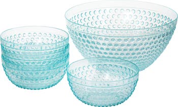 This serving bowl and dining bowl set by Gibson Home is perfect for both outdoor and indoor use. Constructed with lightweight and durable plastic material, use these bowls for your outdoor BBQ without worrying about dropping or breaking your fine ceramic, or use for your childs birthday party to serve snacks and punch! This adorable bowl set is lightly tinted with a light blue clear color and has a fun allover embossed polka dot design. Add some fun and style to your events with this bowl set!