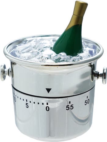 - A whimsical plastic twist timer shaped like champagne on ice, featuring a sleek silver and black color scheme