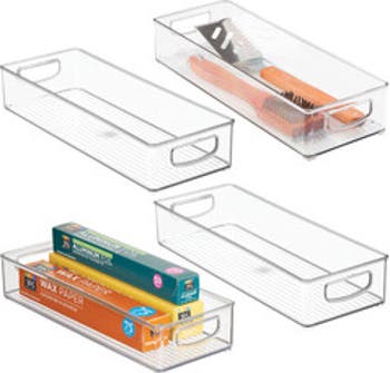 - STACKABLE DESIGN - Raised feet allow bins to stack neatly to conserve space; Bins also fit neatly inside kitchen drawers to organize cooking utensils, small gadgets, and more