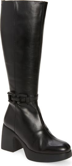 A chunky block heel and lofty platform ground this retro-chic zip boot wrapped in sleek leather and finished with a geometric bit embellishment.