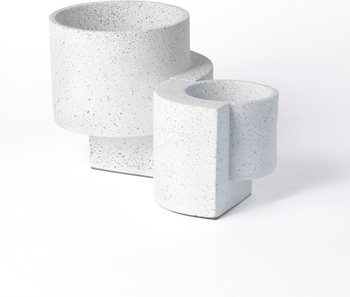 The Platform Planter Collection was designed to connect across color and size to create a multi-level plant landscape. This set includes one small planter (fits a 4" pot) and one medium planter (fits a 6" pot). The white terrazzo is achieved by pouring naturally colored stones into a concrete base. The mint and jungle colors are polished to a smooth finish. All planters have a recessed drainage area.