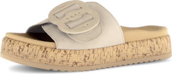 A decorative buckle tops the adjustable strap that offers this handcrafted leather slide sandal a custom fit. A cork platform and treaded rubber sole enhance the lightweight feel.