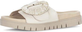 A textured buckle adds boho appeal to this lightweight sandal handcrafted with a contoured footbed and flexible rubber sole.
