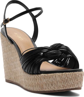 An espadrille-inspired platform wedge amplifies the earthy vibes of this lofty ankle-strap sandal.