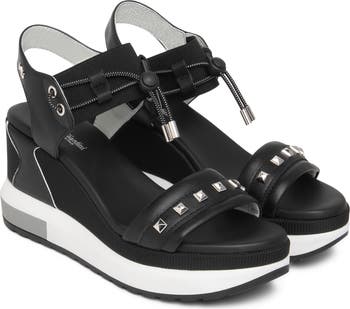 Polished pyramid studs bring modern edge to this lofty platform-wedge sandal that's sure to be a street-style standout.
