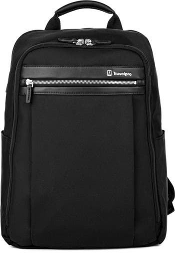 Business is a pleasure with the stylish, organized, and durable Travelpro Platinum Elite Business Backpack. This ideal commuting companion carries it all to and from work, the gym, shopping, and even out-of-town trips. Inside-out organization includes padded sleeves to protect electronics, a Travelpro ID TheftBlock pocket to protect credit cards and passports against loss and identity theft, and compartments for power cords, power banks, and more. Exterior side pockets are perfect for water bottles or an umbrella, and a . Travelpro QuickSlip front pocket securely stores a cell phone or other often used item for quick retrieval. Constructed for frequent and lasting use, this backpack has ECOFAB interior lining that is easy to clean and made from recycled plastic bottles, and ultra-durable, high-density exterior fabric that is treated to resist stains and abrasions. Full-grain leather touches add sophistication and hardy YKK zippers stay on track and glide with ease. Carrying options include a leather top handle, ergonomic, adjustable shoulder straps, and an integrated rear strap that slides over the extension handle of a rolling suitcase for secure stacking.