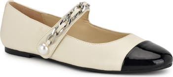 Chain-link hardware and a pearly bead enrich the mary jane strap on a luxe flat fashioned with a glossy cap toe.