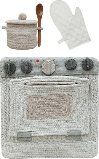 A 100% handcrafted textile kitchen! Handcrafted using a braided cord made of fibers from recycled PET-bottles mixed with cotton, the rectangular Kitchen basket is made carefully by our skilled artisans and full of details: the front features a rectangular door and a cotton canvas panel with five knobs that can be turned around. On top, embroidered cords simulate a traditional gas stove. Comes with a small pot in braided RugCycled cord and a quilted oven glove. The kitchen is made in Blue Sage color, with details in Pearl grey and Dark grey. Packed individually in a carton box.