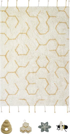 Follow the bee on its journey from the flower to the beehive! A rectangular play rug made of soft cotton pile in Ivory color decorated with a labyrinthine pattern in Light honey. The rug is finished at the edges with Honey colored braids, and comes together with four handmade accessories to play with: a Honey color beehive of cotton cords, a Blue Sage canvas flower, a printed cotton canvas honeycomb and a cute little bee.