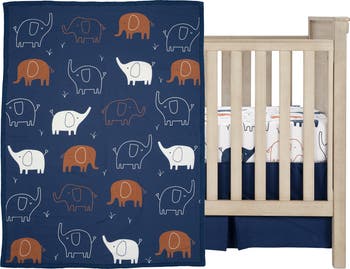 This charming 100% cotton three-piece crib bedding collection includes one quilt, one fitted crib sheet and one crib skirt. The reversible quilt is 100% cotton in indigo blue on one side and crisp white on the reverse side. Cute, contemporary white, caramel and indigo blue elephants decorate the front and back of the reversible quilt. The 100% cotton fitted crib sheet is on a white ground with indigo blue, caramel, and white elephants, some filled in with color and others in silhouette. The coordinating indigo blue crib skirt has two front pleats with a 14 ½” drop. The four sided crib skirt is tailored with split corners for easy placement around the crib posts. This three-piece bedding set is the perfect way to create a playful and inviting nursery for your little one.