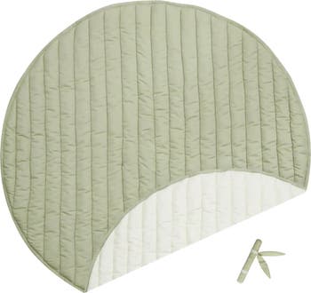 A round-shaped soft padded baby playmat with a hand-quilted pattern. The playmat is reversible, showing one side in Olive and the reverse in Natural. Made of certified organic cotton with a soft handfeel, the playmat comes with a separate handcrafted crinkle and rattle stimulation toy in the shape of a cane with leaves. The playmat comes rolled up with a belly band in recycled carton paper.