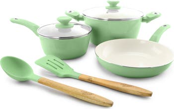 The Gibson Home Plaza Cafe 7 Piece Essential Core Aluminum Cookware Set in Mint offers you the most important and essential pieces to have in any kitchen. Whether you are renewing your cookware or starting a brand-new home, this cookware will give you all the most important items you need for every day cooking. Crafted from aluminum and decorated in a beautiful mint hue, this set is built for both durability and style. This collection is also stovetop friendly and versatile as it is compatible with Gas, Halogen, Electric, and Induction cook tops. Start your kitchen collection off right with this mint cookware collection!