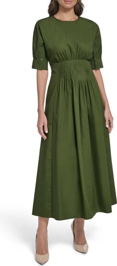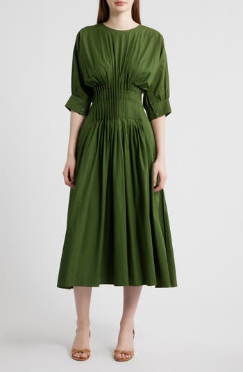 Neat pleats swirl and shape the style of a cotton poplin dress offered in a verdant hue.