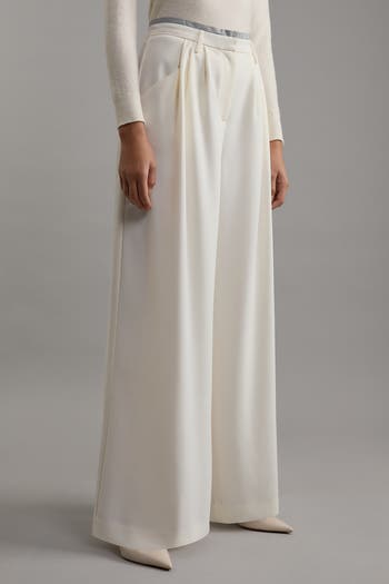 Tailored wide leg trousers with elegant pleat detailing for added movement and dimension. Sophisticated contrast waistband creates a striking visual accent. Practical side pockets seamlessly integrated into the design. Floor-sweeping length creates a dramatic silhouette. Versatile crepe fabric offers structure whilst maintaining a fluid drape. These karen millen wide leg trousers showcase contemporary tailoring with their distinctive pleat detailing and dramatic proportions.