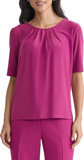 Crisp neckline pleats texture this fluid top framed by elbow-length sleeves and kissed with stretch for shape-retaining power.