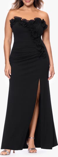 Architectural and dramatic, this strapless scuba gown is designed with a sculpted, fitted bodice and a softly flared A-line skirt. A sweetheart neckline is framed by a dimensional pleated organza ruffle that cascades to the hip, while asymmetric pleating adds depth and shape. Finished with a deep front slit, it's a striking silhouette that balances structure with fluid movement.