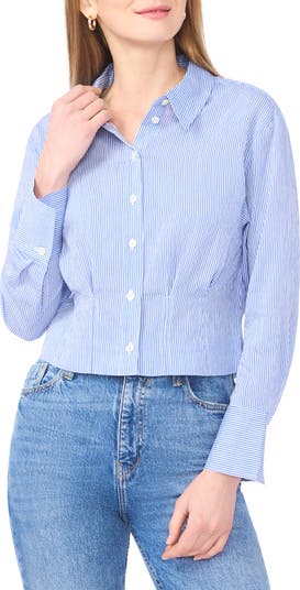 The wardrobe-classic button-up is reimagined in a cropped silhouette with precisely placed pleats that softly nip in the waist.