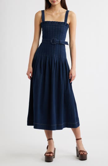 A matching belt hugs your curves as you breeze through your day in this pleated midi dress made of cotton-blend denim.