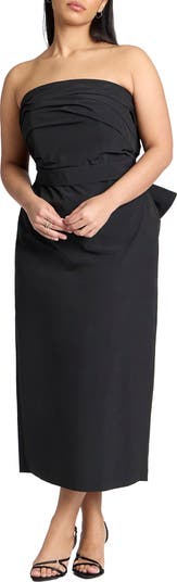 A strapless woven midi with artful front-and-back draping and a sleek tailored line.