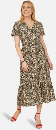 Style meets safari in this cute button down midi dress. With all over mini leopard print that is bang on trend and perfect for the changing seasons. Looks super stylish with boots, tights and a bomber jacket for the cooler weather or switch to sandals in the summer, The V neckline is framed by short sleeves.