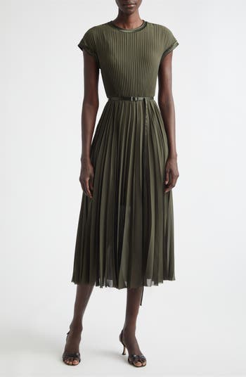 Narrow pleats widen at the skirt on this softly pleated chiffon midi dress subtly accented with satiny shine at the neck, cap sleeves and belt-cinched waistline.