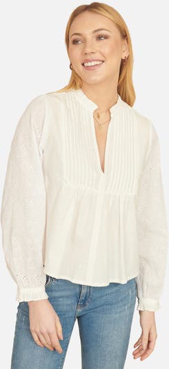 We love this easy and relaxed shirt for the summer. Made from cotton for a cool and chic look, with a bib style front, notch neckline and broderie anglaise sleeves. Pair with denim and trainers for everyday wear.