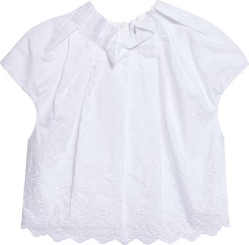 The Irish designer's perennial sweetness springs forth in this sculptural cotton-poplin top, where crisp pleats fan out like flower petals along the neckline. Broderie anglaise and intricate floral embroidery complete the romantic look.