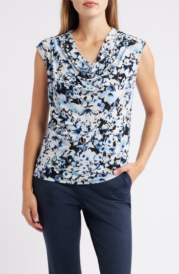 A splashy floral pattern and impeccably draped cowl neck make this extended-shoulders top an ideal option for the office and beyond.