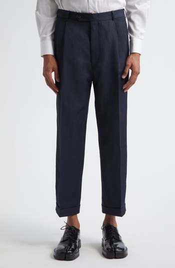 An uncomplicated counterpoint to the maison's typical avant-garde designs, these pleated straight-leg pants are just as worthy a wardrobe hero. They're tailored from hardy wool-linen barathea in a cropped cut with permanently upturned cuffs. Margiela's signature four-stitch moniker adds an in-the-know touch at the back.