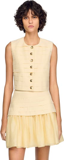 Sleeveless pleated crop top with round neckline, metal button fastening at the front and full lining.