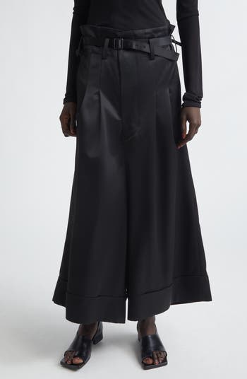 These pleated pants cut from a smooth fabrication woven with a touch of wool are shaped with a high waist and stitched-closed pleats that open into voluminous wide legs. A removable belt equipped with three buckles and deep cuffs at the legs bring avant-garde touches to the style.
