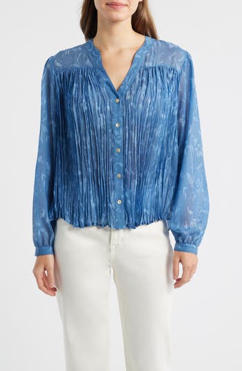 Allover pleats lend depth and dimension to a button-up shirt crafted from lightweight denim to pair well with casual looks.
