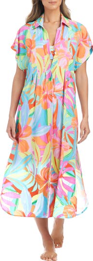 Standout blooms bring brushstrokes of color to this flowy cover-up shirtdress featuring pleats at the waist and framed by dolman sleeves that keep things flowy and airy.