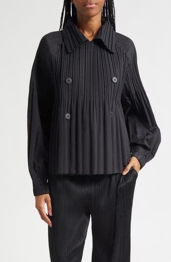 This double-breasted jacket cut in a boxy silhouette features Issey Miyake's signature garment pleating for a wrinkle-resistant, shape-retaining finish.