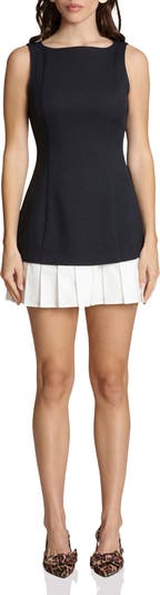 A crisp, pleated skirt sharply contrasts with the smooth bodice of this mixed-media minidress elevated by smart princess seams.