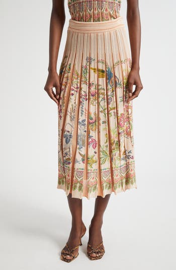 A jubilant garden takes flight across every pleat of this midi sweater-skirt as painterly blooms and bright birds ripple through a cotton-enriched knit with luminous movement. The waist skims clean then falls in finely set pleats that release color with each step for a swish that feels artful and alive.