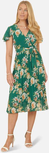 Pretty florals and pleated style all wrapped up for special occasions this season in this skater dress from Yumi. With a tie at the waist for a flattering shape, knee length hemline and fluttery sleeves complete this look.