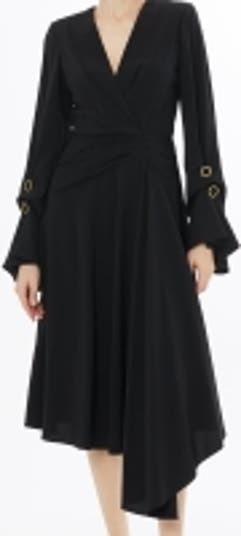 A sophisticated Fall-Winter piece, featuring a V-neckline, long sleeves, and a zippered closure. The design has no pockets and a regular fit with a midi length. The pleated straight form style and lined construction offer elegance and comfort with plain fabric texture.