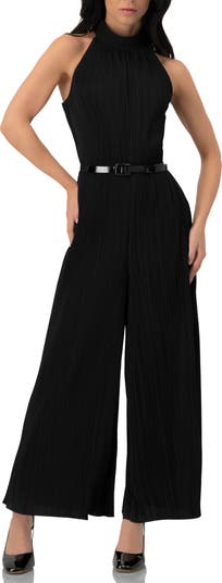 Jumpsuit featuring a high neckline and all-over pleated texture for a sophisticated flow. Designed with a sleek patent belt to define the waist and wide-leg trousers that elongate the silhouette