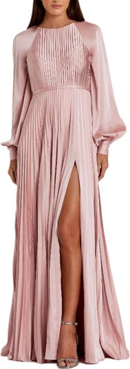 Elegant long sleeve gown featuring a high neckline, blouson sleeves, and a pleated bodice, finished with a flowing skirt and a thigh-high slit.