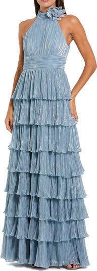 Stunning pleated tiered halter gown with floral detail, featuring a flowing silhouette and shimmering texture. Perfect for formal events and evening occasions.