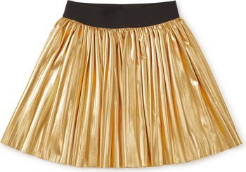 Shine bright in this golden twirl skirt, designed with crisp pleats that move beautifully with every step. The metallic finish brings a festive flair that's perfect for holiday gatherings, parties, and photo-ready moments. An easy pull-on elastic waist makes it comfortable enough for all-day wear, whether paired with a cozy sweater for a dressy-casual look or layered with a velour top for extra glam.